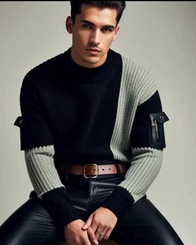 Men’s colour block jumper in black, grey green and leather sleeve pockets