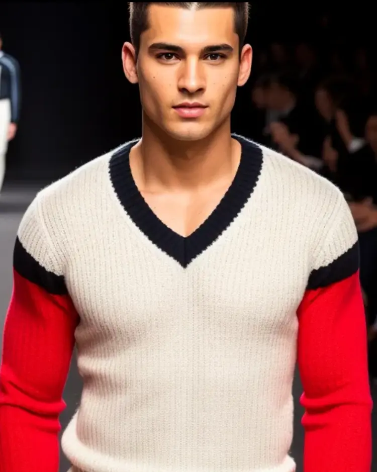 Men’s colour block jumper in cream, black and contrast red sleeves
