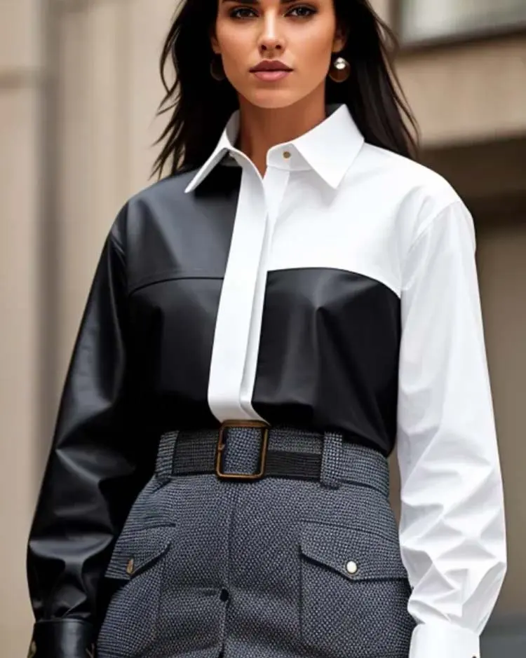 Women’s colour block shirt in white and contrast black leather