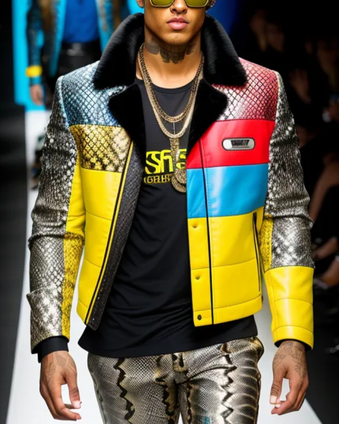 Fur collar snake skin eather jacket in contrast colours.