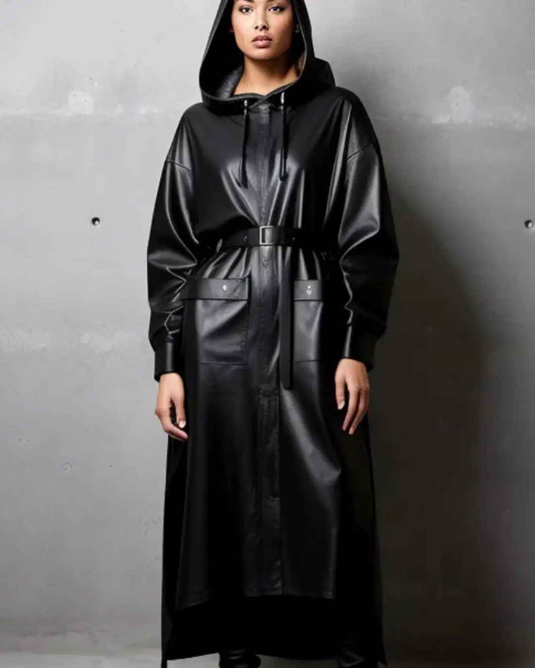 Women’s hooded leather coat with high low hem in black