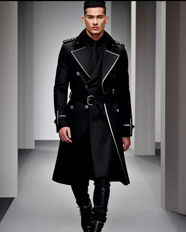 Men’s military style double layer panel black coat with trim edge