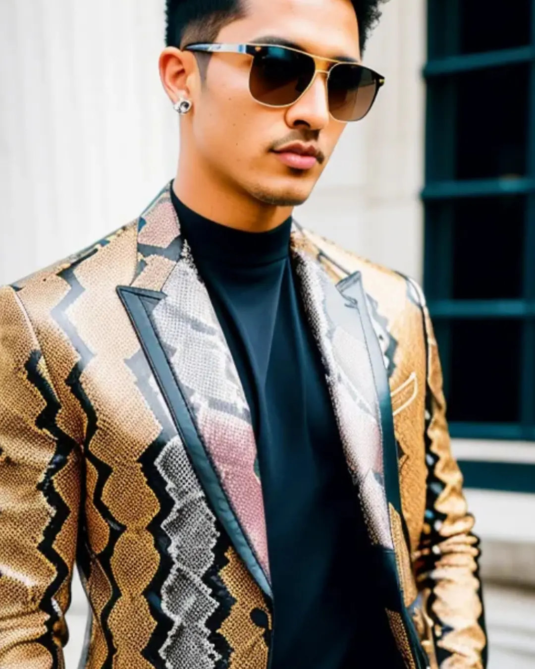Men’s yellow gold snake print tailored leather jacket with black trim detail