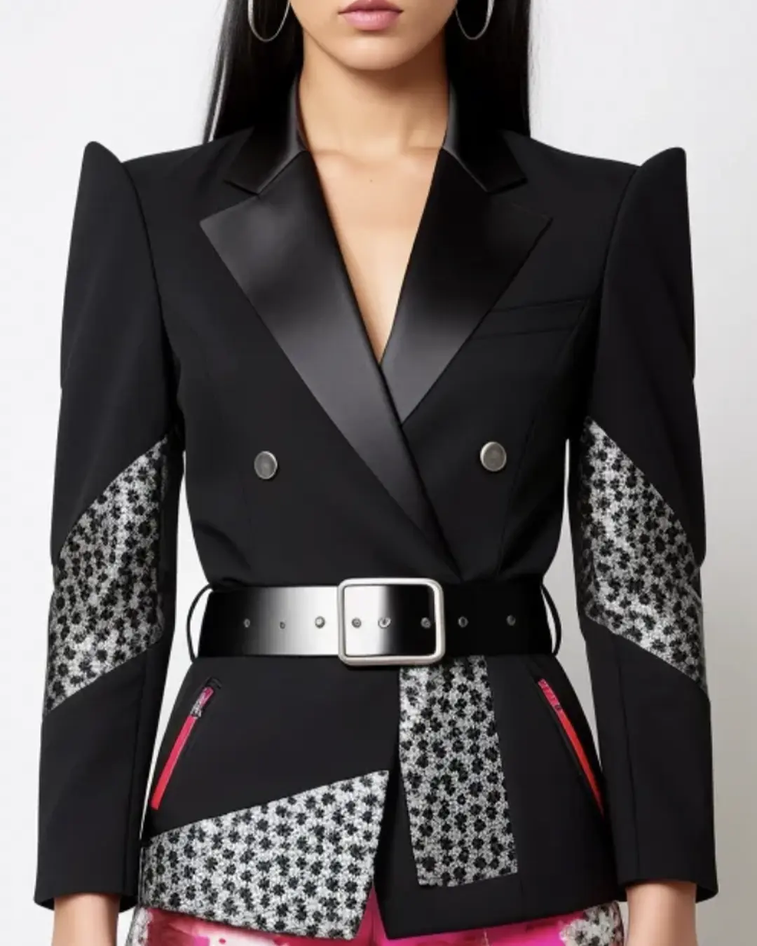 Women’s colour block tailored jacket in black and contrast print