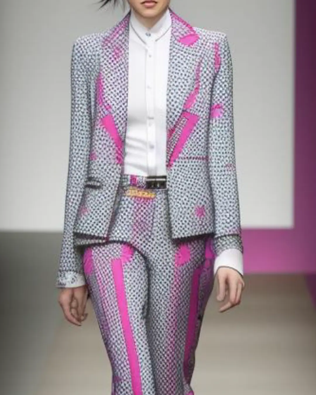 Women’s tweed tailored suit in grey with hot pink paint brush effect